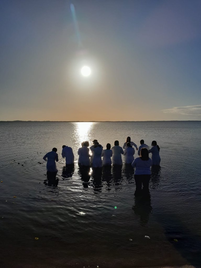 Foi um dia de muita emoção e amor, chegamos à praia juntos com o nascer do Sol! A manhã estava linda, a água cristalina e calma. Iniciamos o trabalho ao som dos pássaros que nos receberam com rasantes de bandos sobre a corrente.